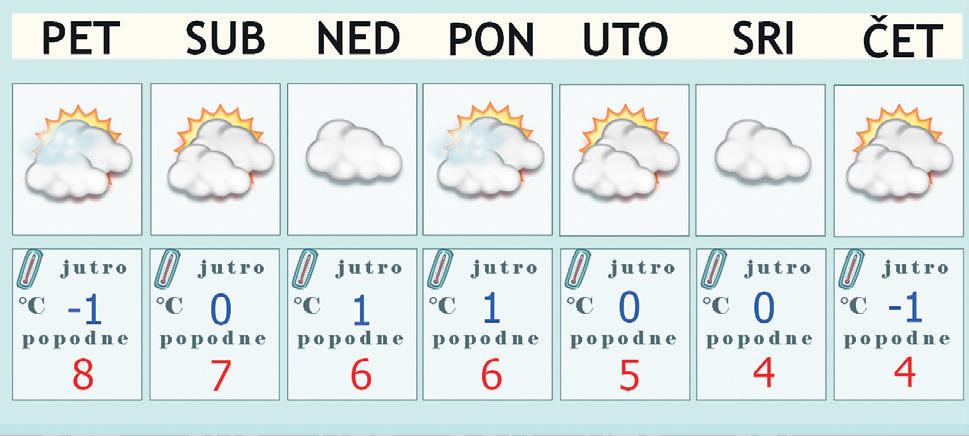 nima možda uopće nećemo vidjeti. Nema ni nekih obilnih oborina, ali tu i tamo može pasti sasvim malo kišice ili susnježice. Temperatura noću oko nule, a danju oko 5, 6 Celzijevih stupnjeva... Na kraju napomena da je dobro redovito pratiti prognozu