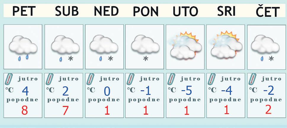 U nedjelju će oborina biti znatno manje, postupno će oslabjeti i prestati. Temperatura zraka oko ili malo iznad nule uz sjeverni vjetar.