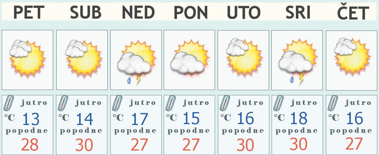 U subotu i dalje većinom sunčano, suho i vrlo toplo. Temperatura bi mogla uhvatiti trideset stupnjeva u hladu, ali sve je to prihvatljivo ljetno vrijeme bez prevelike vrućine i sparine.