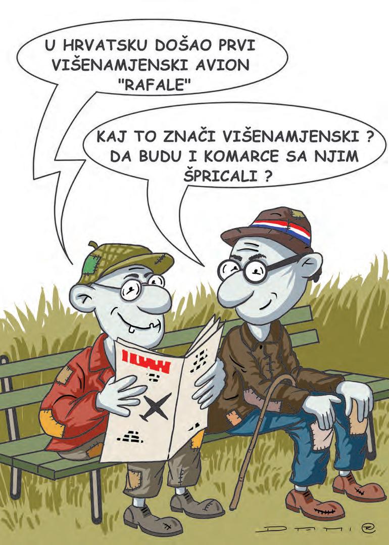 Ne bi vam znal točno reči kuliko je cajta minulo od kak so se naši političari počeli spominati kaj bode Lepa naša nabavila nove reoplane šteri bodo pazili naše plavo nebo. Znuom sam da je to bilo dosti predi korone i kak so naši političari ne mogli nigdi na sveto, najti nekoga što bi delal ruon takše reoplane kakše mi nucamo. Ne bodete veruvali, ali niti Ameri so ne do dneva denešjega uspeli naprajti ruon takše reoplane kakše bi mi nucali. I na se zadje naš premijer je hitil kocko, a ona se zastajla na Francozima tak da je of tjeden došel prvi reoplan, prvi Rafal, šteri bo branil naše nebo. Morem vam reči da čim je došel mam so se naši ftiči pobunili jerbo ve so ne navčeni kaj bi se još nešči vozikal po naši nebi osim ftičov. Sa je sreča kaj je prvi Rafal došel ve na jesen dok so se lastavice i rode preselile v topleše kraje tak da ga na naši nebi dosti mesta.