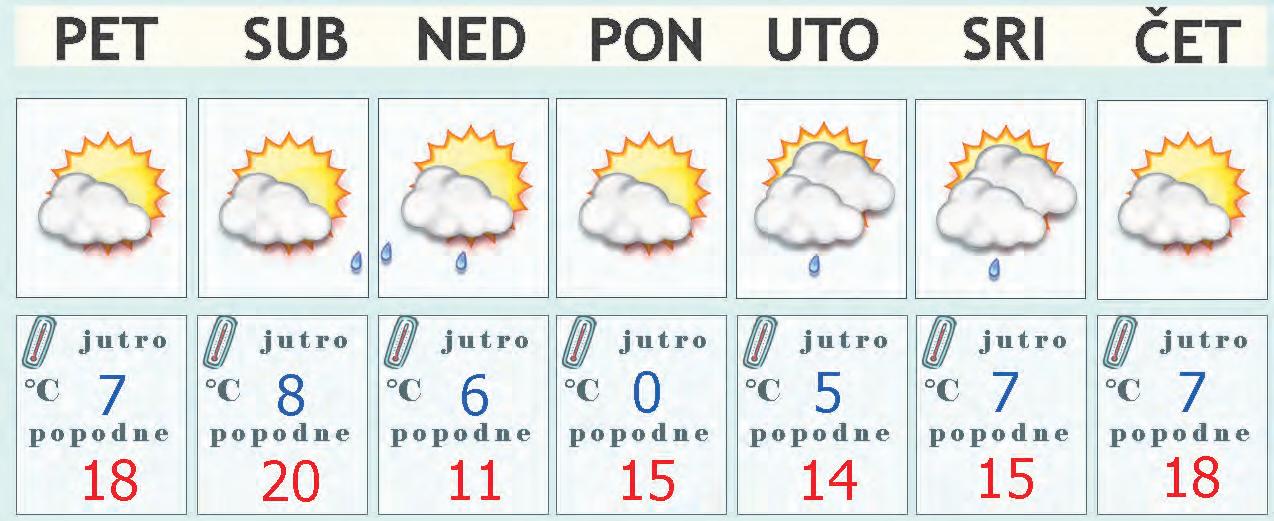 VREMENSKA PROGNOZA: Petak nam najavljuje uglavnom suho vrijeme, izmjenjivat će se sunce i povremena naoblaka, rijetko gdje uz koju kap kiše. U popodnevnim satima možemo očekivati temperaturu između 15 i 18 Celzijevih stupnjeva uz lagani južni vjetar.