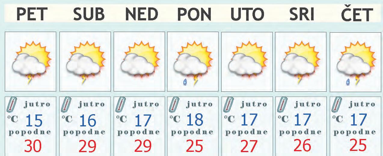 gućnost za neki kraći lokalni pljusak postoji u kasnim popodnevnim ili večernjim satima. Njih će više biti u Austriji i Sloveniji, ali mogu okrznuti i nas. Jutarnja temperatura još uvijek ugodna, a najviša dnevna oko 30 Celzijevih stupnjeva.