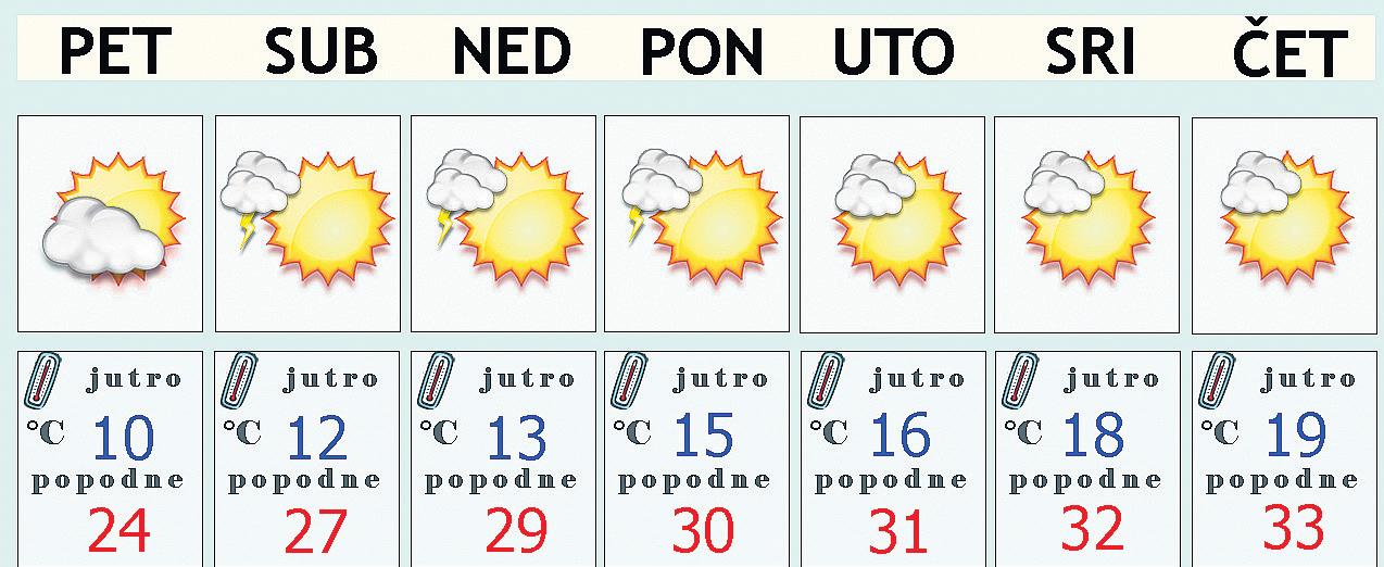 no. Nakon ugodne jutarnje svježine dnevna temperatura ide do 27 Celzijevih stupnjeva. Kasno popodne u Austriji, Sloveniji i Mađarskoj su mogući pljuskovi pa nije isključeno da i nas nešto kratko okrzne. U nedjelju i ponedjeljak puno sunčanog vremena uz temperatu-