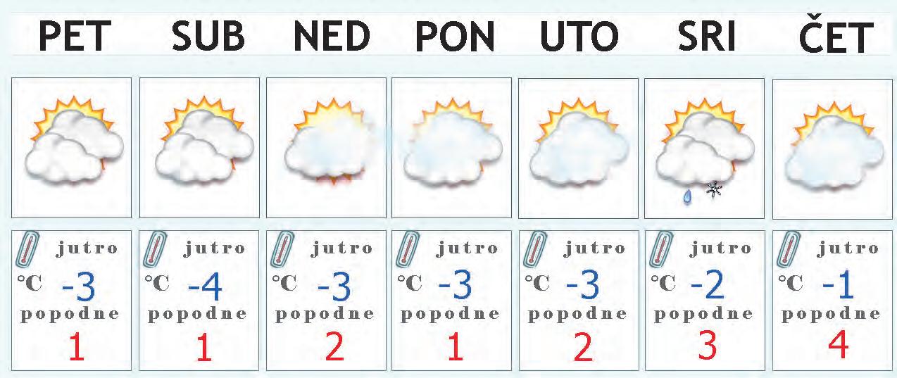 VREMENSKA PROGNOZA: I petak nam donosi uglavnom suho i hladno zimsko vrijeme uz većinom slab vjetar. Jutarnja temperatura između -7 i -3, a najviša dnevna samo malo u plusu. Postoji mogućnost za malo