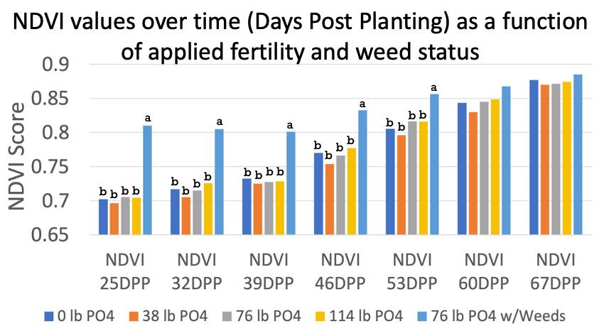 Figure 1 NDVI Values over the planting season. Statistical differences existed for the first 53 DPP due to the presence of weeds. No differences resultant from PO4 reported