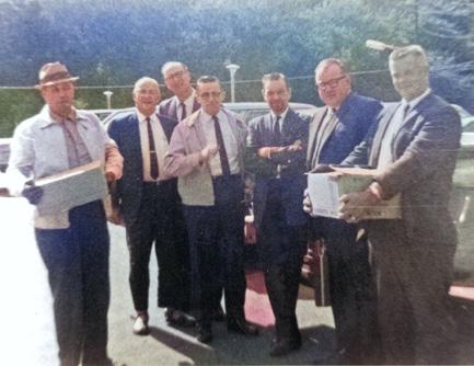 John S. Evans (back row, third to left) joins farmer colleagues in casting the first checkoff vote in September 1969. The referendum finally passed in 1973.
