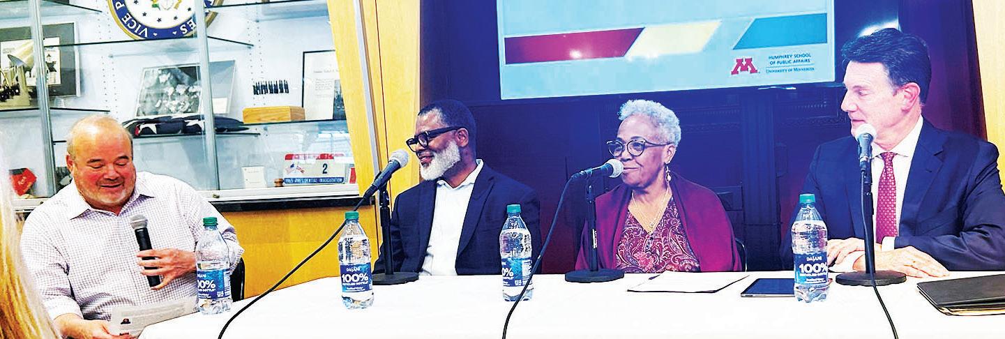 In addition to Williams-Dillard, the panel consisted of Duchesne Drew, senior vice president of American Public Media Group and president of Minnesota Public Radio; and Tim Blotz, news anchor and reporter for Fox 9 and Fox 9+ Television. The moderator was Professor Larry Jacobs, McKnight presidential chair in public affairs, the Walter F. and Joan Mondale chair for political studies, and director of the ■ See HUMPHREY on page 5