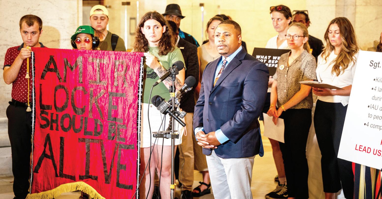 mir Locke Should Be Alive,” read a banner held by community members during a press conference at Minneapolis City Hall on July 22. The gathering, organized by Communities United Against Police Brutality (CUAPB), condemned the Minneapolis Police Department’s decision to appoint Sgt. Mark Hanneman as its new use-of-force training officer.