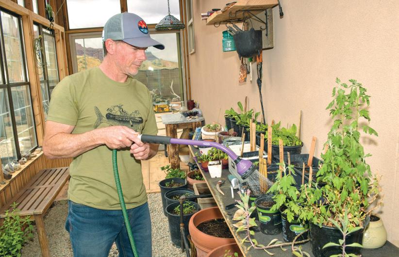 Top: Moab resident Jason Kirks watering plants at his home. [Photo by Murice D. Miller]
