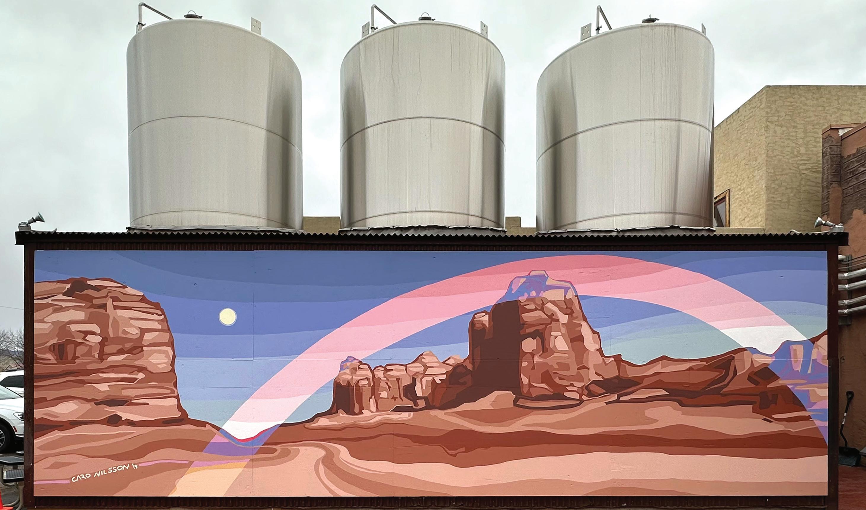 Salt Lake City-based artist Caro Nilsson is often inspired by her experiences in the natural world. She paints from memory, rather than photographs, because she says that helps her more effectively capture the feeling of the experience. Her mural “Moonrise Over Gemini Bridges,” which is outside the Moab Brewery, combines multiple experiences she’s had in Moab.