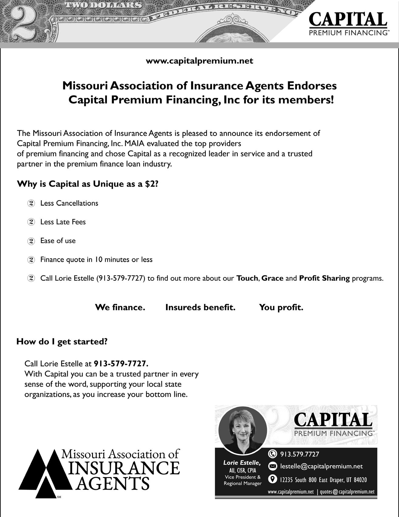 MISSOURI AGENT (USPS 709-210) is published bimonthly by the Missouri Association of Insurance Agents, 3315 Emerald Lane, Jefferson City, Mo. 65109, Phone: 573-8934301. Periodical postage paid at Jefferson City, Mo. and additional mailing offices.
