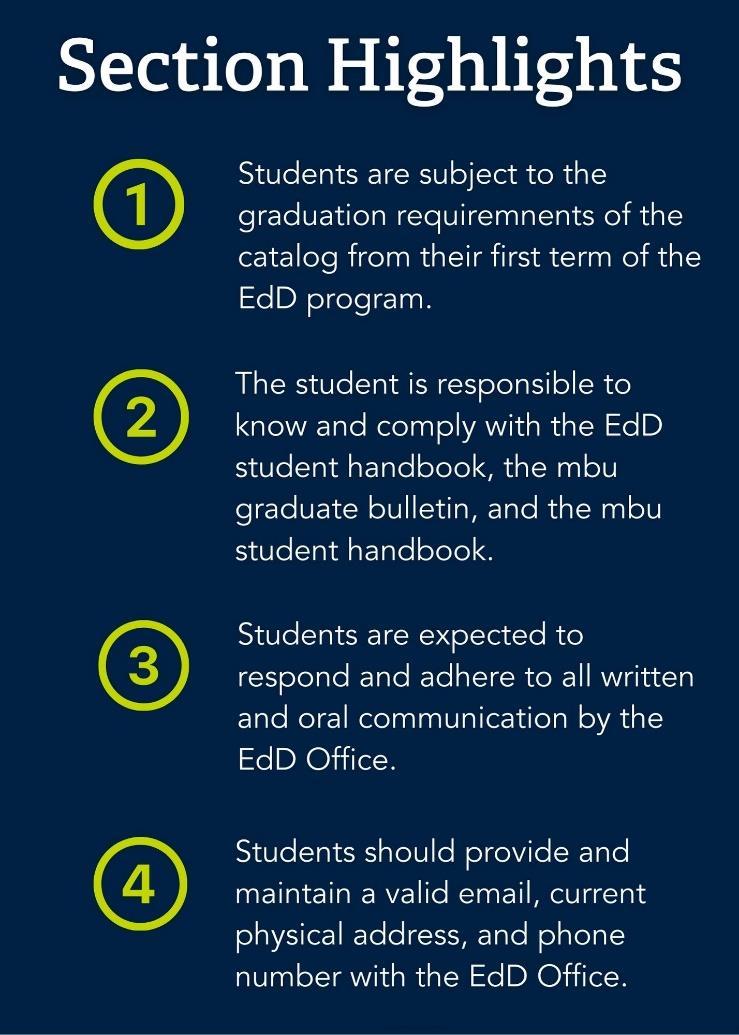 The Doctor of Education Student Handbook should be considered an official supplement to Missouri Baptist University’s Graduate Bulletin. The EdD Student Handbook contains policies, procedures, and other additional information that govern the EdD programs. The student is responsible to comply with the regulations contained in the EdD Student Handbook, as well as the MBU Graduate Bulletin and Spartan Virtues, which is the central document for the rights, responsibilities, Code of Conduct, and other policies governing students. Both documents are available on MBU’s website.