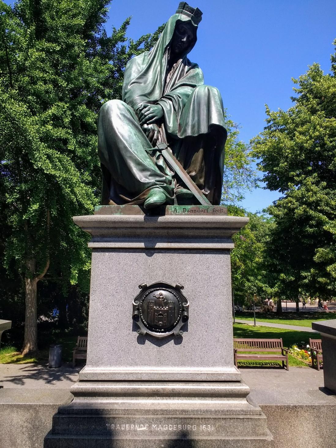 “Weeping Magdeburg” (“Trauernde Magdeburg”) is one of the statues at the Luther Monument. The allegorical female figure sits with head bowed, wearing a city crown and holding a blunt sword. She symbolizes the martyrdom of the Protestant city of Magdeburg, Germany, which was sacked by Imperial and Catholic forces during the Thirty Years’ War (1631).