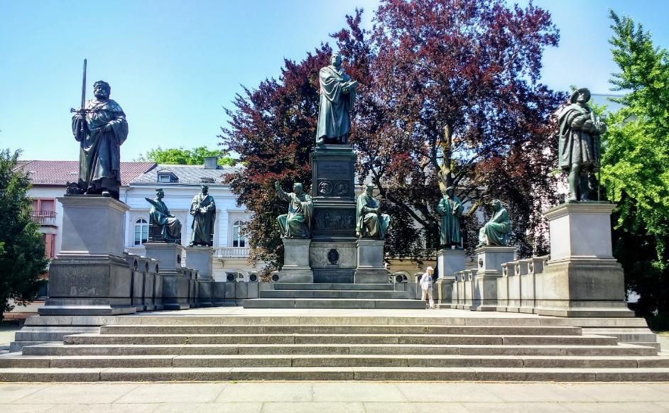 The Luther Monument (Lutherdenkmal) in Worms, erected in 1868, honors Martin Luther and other key figures of the Protestant Reformation, including John Calvin and Ulrich Zwingli. At its center stands the tallest statue of Luther, holding a Bible in his left hand, symbolizing his unwavering stand for Scripture during the Reformation.
