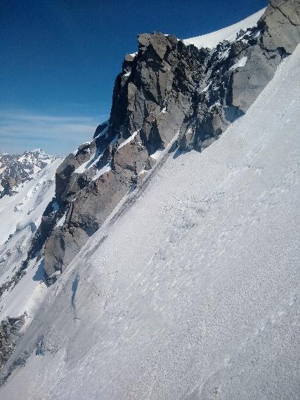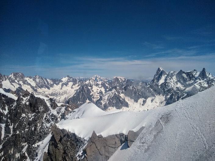 Reaching the peak of Mont Blanc, 15,777 feet above sea level, requires two gondola trips. Some travelers stop at the first station before descending, while others take the second gondola to reach the summit. The journey to the top is not for the faint-hearted, as the gondola sways with several hesitant back-and-forth movements before arriving at a platform perched above a nearly vertical cliff. Although we traveled in June, the mountain’s elevation required us to wear several layers of clothing.