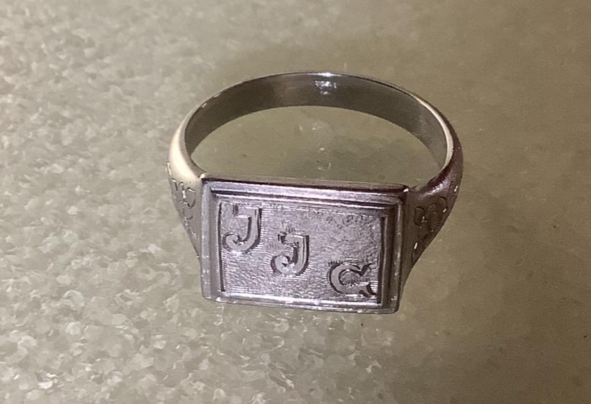 The initial ring my great-grandfather had made from the fragment the German V-2 Rocket that struck him.