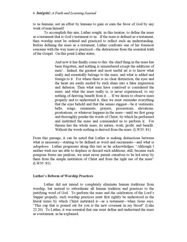 6 Intégrité: A Faith and Learning Journal to us humans, not an effort by humans to gain or earn the favor of God by any work of man himself. To accomplish this aim, Luther sought, in this treatise, to define the mass as a testament that is God’s testament to us. If the mass is defined as a testament, then worship must be ordered and practiced to reflect such an understanding. Before defining the mass as a testament, Luther confronts one of his foremost concerns with the way mass is practiced—the distractions from the essential truth of the Gospel. On this point Luther states, And now it has finally come to this: the chief thing in the mass has been forgotten, and nothing is remembered except the additions of men!... Indeed, the greatest and most useful art is to know what really and essentially belongs to the mass, and what is added and foreign to it. For where there is no clear distinction, the eyes and the heart are easily misled by such sham into a false impression and delusion. Then what men have contrived is considered the mass; and what the mass really is, is never experienced, to say nothing of deriving benefit from it…. If we desire to observe mass properly and to understand it, then we must surrender everything that the eyes behold and that the senses suggest—be it vestments, bells, songs, ornaments, prayers, processions, elevations, prostrations, or whatever happens in the mass—until we first grasp and thoroughly ponder the words of Christ, by which he performed and instituted the mass and commanded us to perform it. For therein lies the whole mass, its nature, work, profit, and benefit. Without the words nothing is derived from the mass. (LW35: 81) From this passage, it can be noted that Luther is making distinctions between what is necessary—starting to be defined as word and sacraments—and what is adiaphora. Luther progresses along this tact as he acknowledges, “Although I neither wish nor am able to displace or discard such additions, still, because such pompous forms are perilous, we must never permit ourselves to be led away by them from the simple institution of Christ and from the right use of the mass” (LW35: 81). Luther’s Reform of Worship Practices Luther did not intend to completely eliminate human traditions from worship, but instead to subordinate all human tradition and practices to the justifying word of God. To perform the mass and the celebration of the Lord’s Supper properly, such worship practices must first rightly be understood in the literal terms by which Christ instituted it—as a testament—when Jesus says, “This cup that is poured out for you is the new covenant in my blood” (Luke 22:20). To Luther, it was essential that one must define and understand the mass as a testament, as he explained,