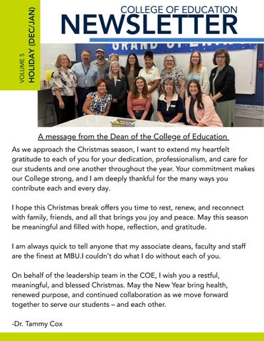 The fall semester is off to a strong start in the College of Education, and I am excited with the energy our students are bringing to their field experiences. We are seeing a steady increase in our student numbers this fall (72 total), with more students stepping into classrooms to gain invaluable, handson practice. This growth is encouraging as it reflects both the dedication of our students and the strong partnerships we continue to build with schools across our region. In addition, we welcomed a number of new University Supervisors over the summer which is a blessing that they too want to give back to the profession her at MBU. We are also excited to share updates to our undergraduate certification program. This year, we ’ ve implemented GoReact to enhance observation and feedback, creating richer opportunities for reflection and growth. In addition, our new Online Certification Program (OCP) has officially launched and will also utilize GoReact, extending access and support to even more future educators.