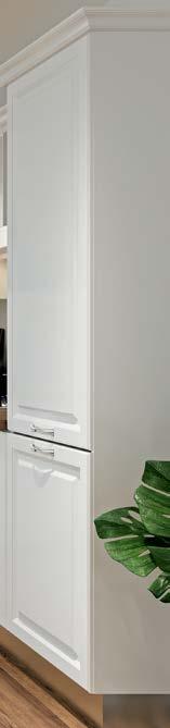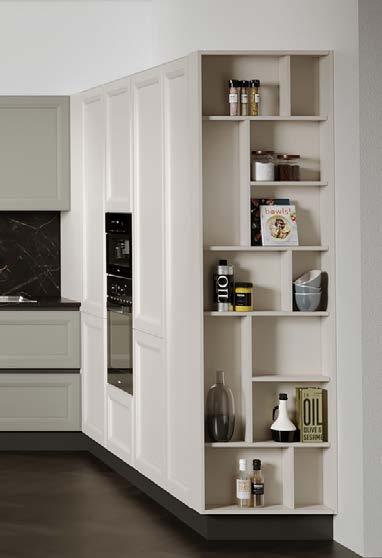 Fronturi cu ramă din lemn masiv de frasin de 24 mm şi tăblie furniruită cu furnir de frasin, disponibile în finisajele alb şi ivoriu.