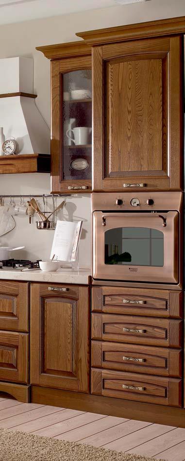 Fronturi cu ramă din lemn masiv de frasin de 24 mm şi tăblie furniruită cu furnir de frasin, disponibile în finisajele alb, crem, ivoriu, grej. Structura este realizată din panouri aglomerate din lemn melaminat de 18 mm. Blat melaminat termorezistent de 38 mm grosime.