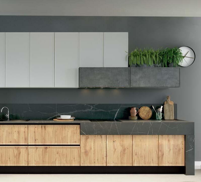 Fronturi realizate din MDF de 24 mm, cu acoperire polimerică. Modelul este disponibil în finisaje mate (stejar, gri ceramic, alb striat) şi finisaje ultramate (gri piatră, gri arctic, gri onix, bej, alb, grafit). Structura este realizată din panouri aglomerate din lemn melaminat de 18 mm grosime. Blat melaminat termorezistent de 38 mm grosime. Mânere metalice tip profil Gola, disponibile în finisajele aluminiu, alb şi negru.