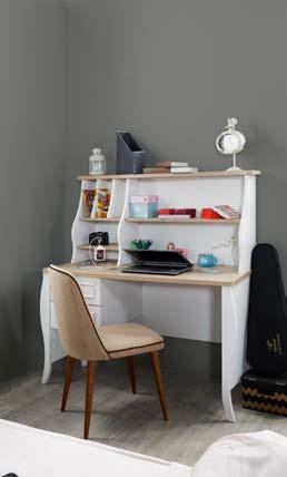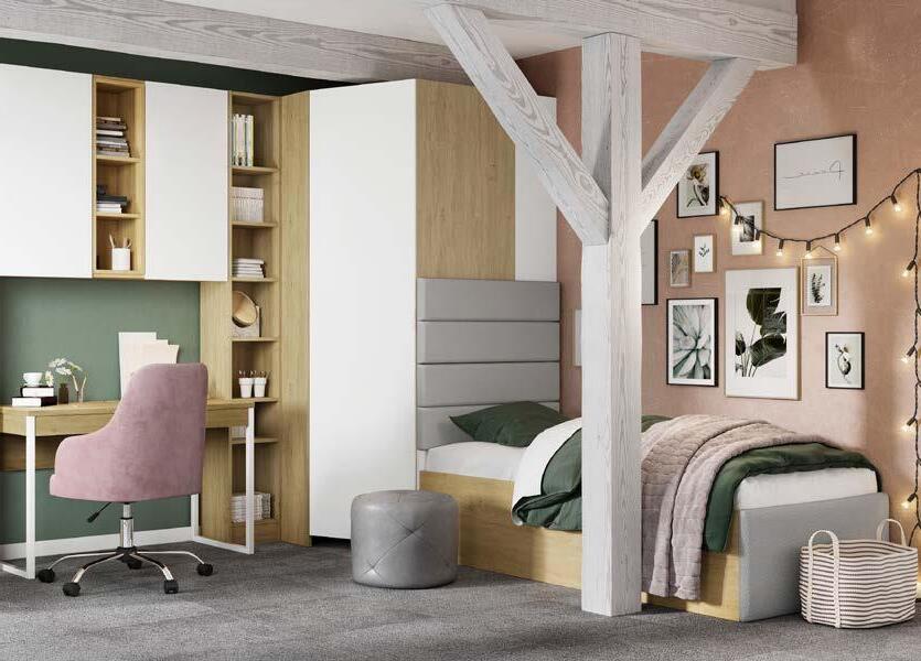 1. Pat cu tăblie tapiţată cu stofă, finisaj roz sau gri. Somieră inclusă. Saltea recomandată 80x160 cm. Preţul patului nu include salteaua. Lei 2.682 Lei 2.146 | 2. Birou Lei 1.783 Lei 1.426 | 3. Etajeră 4 nişe Lei 666 Lei 533 4. Etajeră 1 sertar Lei 898 Lei 718 | 5. Panou tapiţat Lei 73 Lei 58