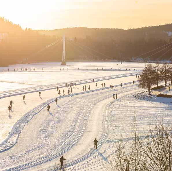 Europe's coolest city is cool in all four seasons. As dusk falls earlier and earlier in the autumn, Jyväskylä glows even brighter. The city has invested in quality urban lighting for more than 25 years and currently has more than a hundred permanently illuminated locations, such as bridges, building facades and works of art. Illuminated landmarks such as the observation tower on Harju Ridge, Matti Nykänen's ski jump, Kuokkala Bridge and Kuokkala Water Tower shape Jyväskylä's skyline and welcome visitors to the City of Light. In winter, Lake Jyväsjärvi in the city centre, at Lutakko harbour, freezes over and becomes a two-kilometre-long skating rink.
