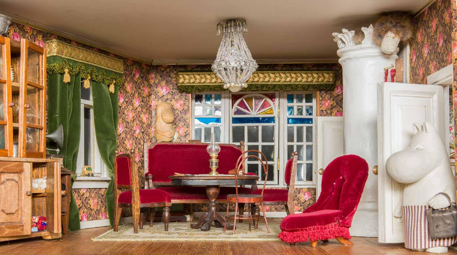 A HIGHLIGHT OF THE EXHIBITION IS THE FULL-SCALE RECREATION OF THE PARLOUR FROM THE MOOMINHOUSE TABLEAU.