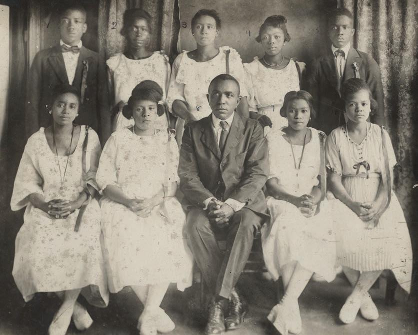 LOOKING TO EDUCATE THEIR CHILDREN, descendants from the last slave ship, Clotilda, established a school in Africatown's Plateau community in 1880. Over the next 30 years, the school morphed and shifted at various locations, and in 1910, Isaiah J. Whitley took the helm as principal. Whitley was described as broad-minded and progressive. He transformed the school, previously known as The Plateau Normal and Industrial Institute, into the Mobile County Training School, the first school of its kind for Blacks in the state of Alabama. Seen below is the first graduating class with Whitley seated amongst them. According to archive records, the majority of the women in the photo would go on to hold teaching positions in Mobile County. Two ladies pictured, Hattie Keeby and Agnes Finley, went on to study at Tuskegee Institute, while the two men accepted positions as principals in the Andalusia, Alabama, school system.