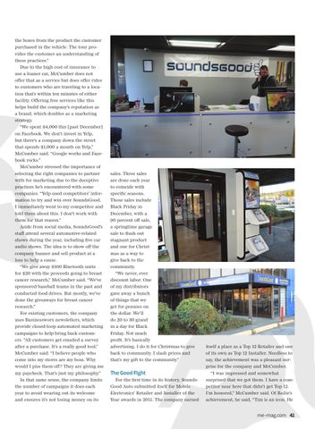 the boxes from the product the customer purchased in the vehicle. The tour provides the customer an understanding of these practices.” Due to the high cost of insurance to use a loaner car, McCumber does not offer that as a service but does offer rides to customers who are traveling to a location that’s within ten minutes of either facility. Offering free services like this helps build the company’s reputation as a brand, which doubles as a marketing strategy. “We spent $4,000 this [past December] on Facebook. We don’t invest in Yelp, but there’s a company down the street that spends $1,000 a month on Yelp,” McCumber said. “Google works and Facebook rocks.” McCumber stressed the importance of selecting the right companies to partner with for marketing due to the deceptive practices he’s encountered with some companies. “Yelp used competitors’ information to try and win over SoundsGood. I immediately went to my competitor and told them about this. I don’t work with them for that reason.” Aside from social media, SoundsGood’s staff attend several automotive-related shows during the year, including five car audio shows. The idea is to show off the company banner and sell product at a loss to help a cause. “We give away $100 Bluetooth units for $20 with the proceeds going to breast cancer research,” McCumber said. “We’ve sponsored baseball teams in the past and conducted food drives. But mostly, we’ve done the giveaways for breast cancer research.” For existing customers, the company uses Businessworx newsletters, which provide closed-loop automated marketing campaigns to help bring back customers. “All customers get emailed a survey after a purchase. It’s a really good tool,” McCumber said. “I believe people who come into my stores are my boss. Why would I piss them off? They are giving me my paycheck. That’s just my philosophy.” In that same sense, the company limits the number of campaigns it does each year to avoid wearing out its welcome and ensures it’s not losing money on its