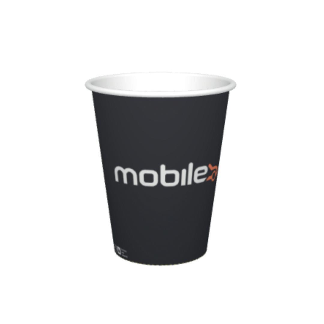 En mappe med plass til diverse dokumenter og papirer. Pappkopper til varm drikke med Mobile-logo
