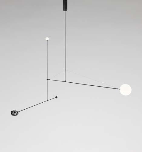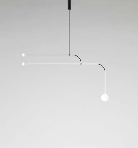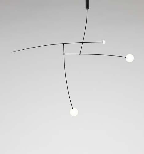 The Mobile Chandeliers (above) by Michael Anastassiades are delicate structures balanced in perfect equilibrium. Constructed following the principles of a mobile, these are arrangements of linear tubes, geometric light sources, reflective surfaces and counterbalancing weights. The pieces rotate freely and delicately, creating an ever-changing lighting configuration unique to the space they occupy.