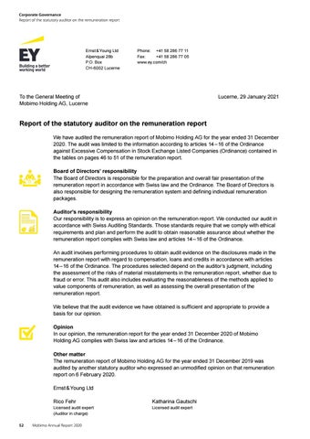 Report of the statutory auditor on the remuneration report We have audited the remuneration report of Mobimo Holding AG for the year ended 31 December 2020. The audit was limited to the information according to articles 14 – 16 of the Ordinance against Excessive Compensation in Stock Exchange Listed Companies (Ordinance) contained in the tables on pages 46 to 51 of the remuneration report. Board of Directors’ responsibility The Board of Directors is responsible for the preparation and overall fair presentation of the remuneration report in accordance with Swiss law and the Ordinance. The Board of Directors is also responsible for designing the remuneration system and defining individual remuneration packages. Auditor’s responsibility Our responsibility is to express an opinion on the remuneration report. We conducted our audit in accordance with Swiss Auditing Standards. Those standards require that we comply with ethical requirements and plan and perform the audit to obtain reasonable assurance about whether the remuneration report complies with Swiss law and articles 14 – 16 of the Ordinance. An audit involves performing procedures to obtain audit evidence on the disclosures made in the remuneration report with regard to compensation, loans and credits in accordance with articles 14 – 16 of the Ordinance. The procedures selected depend on the auditor’s judgment, including the assessment of the risks of material misstatements in the remuneration report, whether due to fraud or error. This audit also includes evaluating the reasonableness of the methods applied to value components of remuneration, as well as assessing the overall presentation of the remuneration report. We believe that the audit evidence we have obtained is sufficient and appropriate to provide a basis for our opinion. Opinion In our opinion, the remuneration report for the year ended 31 December 2020 of Mobimo Holding AG complies with Swiss law and articles 14 – 16 of the Ordinance. Other matter The remuneration report of Mobimo Holding AG for the year ended 31 December 2019 was audited by another statutory auditor who expressed an unmodified opinion on that remuneration report on 6 February 2020. Ernst & Young Ltd Rico Fehr