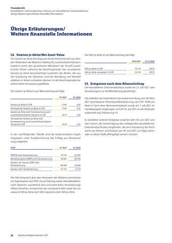 Die anlässlich der ordentlichen Generalversammlung vom 30. März 2021 beschlossene Aktienkapitalherabsetzung von CHF 10.00 pro Aktie in Form einer Nennwertreduktion wurde am 7. Juli 2021 im Handelsregister eingetragen und am 16. Juli 2021 an die Aktionäre ausbezahlt (vgl. Erläuterung 11). Es sind keine weiteren Ereignisse zwischen dem 30. Juni 2021 und dem Datum der Genehmigung des vorliegenden konsolidierten Zwischenabschlusses eingetreten, die eine Anpassung der Buchwerte von Aktiven und Passiven per 30. Juni 2021 zur Folge hätten oder an dieser Stelle offengelegt werden müssten.