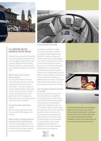 LA VOITURE QUI SE CONDUIT TOUTE SEULE A l’avenir, nous aurons plus de temps libre. Et ce, même pendant nos déplacements, car nous voyagerons à bord d’une voiture autonome. Michael Krohn, de la Haute Ecole d’art de Zurich, a mené une étude sur la mobilité en ville de Zurich à l’horizon 2030. Monsieur Krohn, qu’est-ce qu’une voiture autonome? C’est une voiture efficace et sûre qui vous emmènera à l’heure que vous avez choisie jusqu’à l’endroit que vous lui aurez indiqué – sans que vous ayez à la conduire. Pendant le trajet, vous pourrez donc lire le journal, dormir ou travailler. Lorsque vous en descendrez, elle se garera toute seule et rechargera ses batteries. Et dès que vous aurez à nouveau besoin d’elle, elle vous rejoindra. Vous pensez qu’elle se généralisera un jour? Oui, j’en suis persuadé. Reste à savoir comment notre société réagira à cette mutation. Mais la conduite n’est-elle pas justement ce qui fait le sel d’un trajet en voiture? Je crois que les avantages de la voiture autonome sont plus importants que ses inconvénients. Dans les spots télévisés, on nous montre des automobilistes