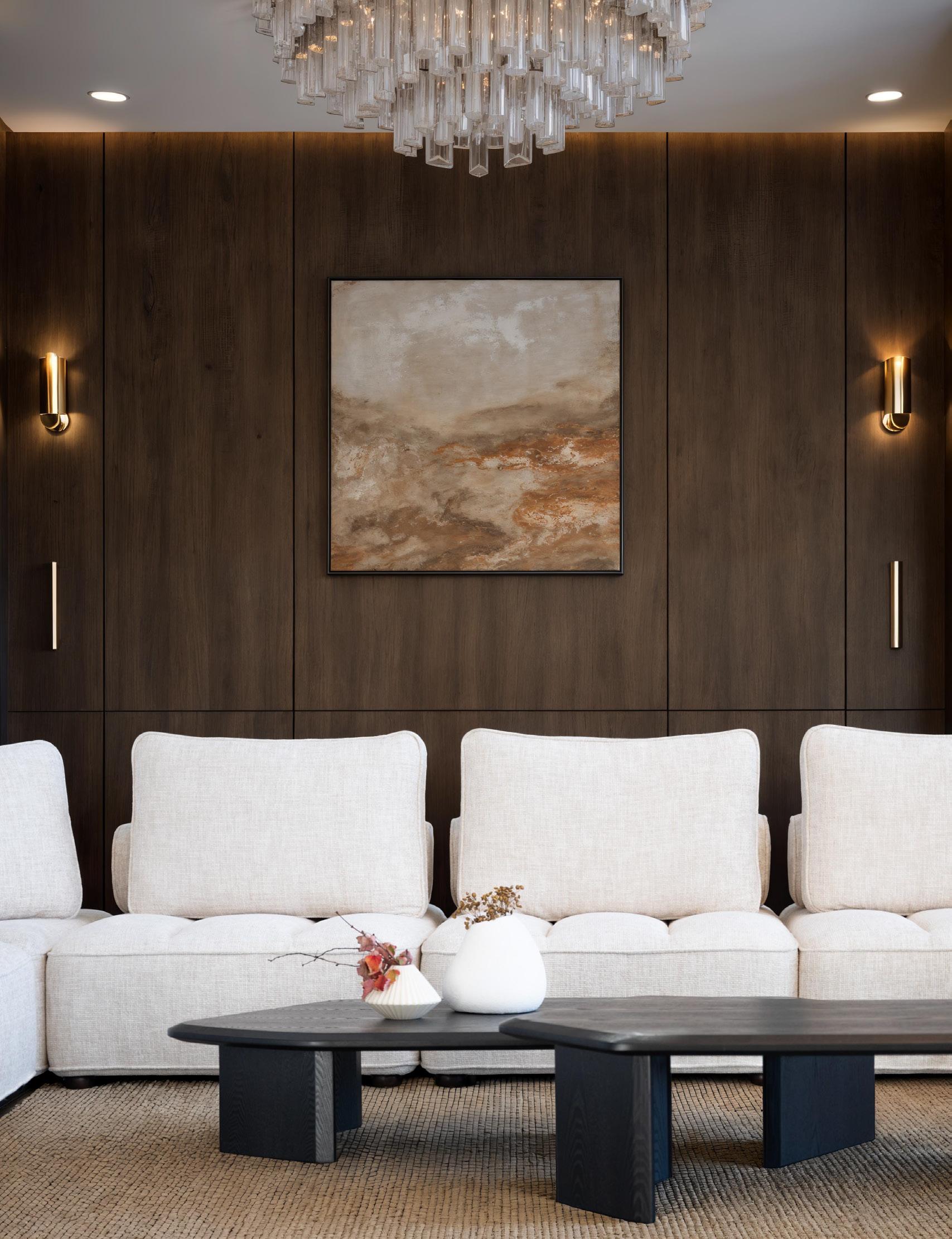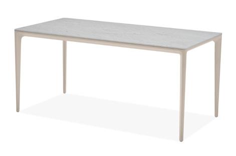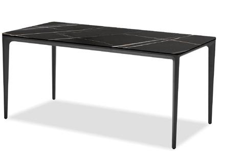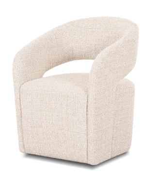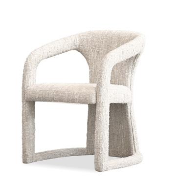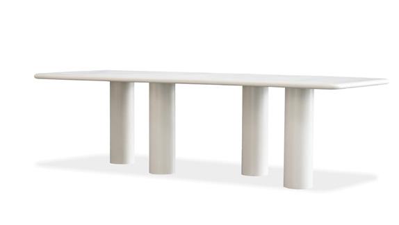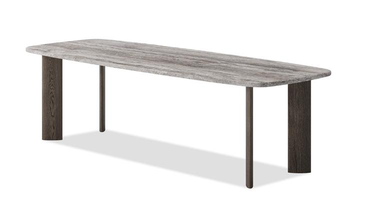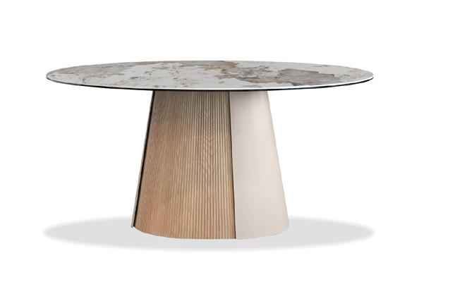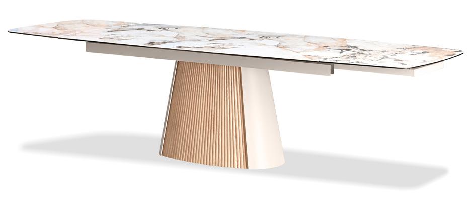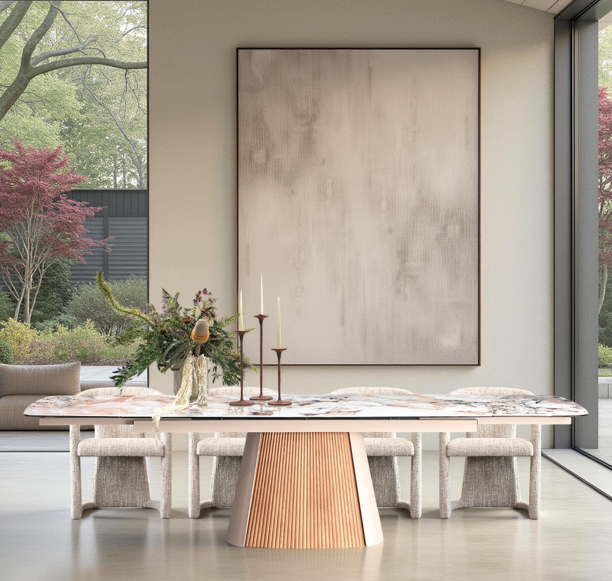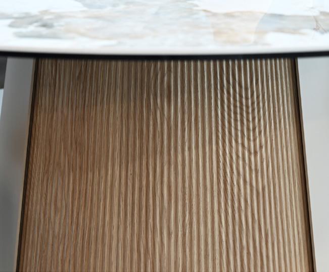 THE GAIA TABLE FEATURES A STUNNING BASE OF FLUTED WHITE OAK VENEER AND A TAUPE POWDER COATING, TOPPED WITH A POLISHED CERAMIC SURFACE IN PATAGONIA MARBLE PATTERN. THIS TABLE FEATURES EXTENSION LEAVES, MAKING IT A PRACTICAL CHOICE FOR ACCOMMODATING GUESTS. THE STYLISH EMMY CHAIRS MAKE THE PERFECT PAIRING, FEATURING A LUXE PEARL STRIATED DISTRESSED BOUCLE FABRIC.