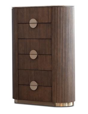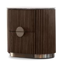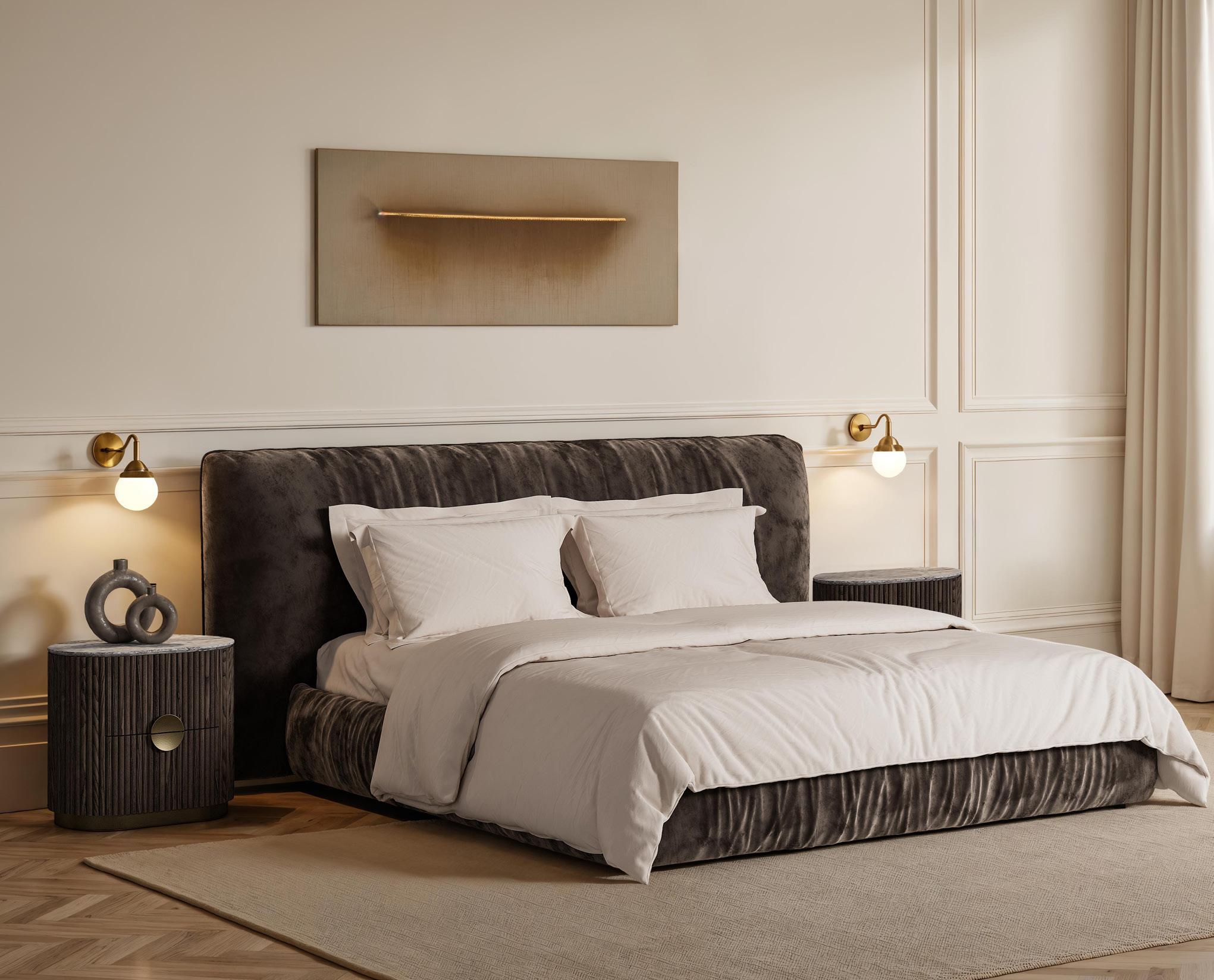 THE SHAR PEI BED IS A LUXE ADDITION TO ANY BEDROOM, WITH ITS OVER EXAGGERATED HEADBOARD AND SOPHISTICATED PLEATED APPEARANCE. UPHOLSTERED IN A SMOOTH CHENILLE COFFEE BEAN FABRIC AND OFFERS AMPLE STORAGE SPACE BENEATH WITH IT’S EASY TO USE HYDRAULIC LIFT, PERFECT FOR THOSE LOOKING TO MAXIMIZE STORAGE SOLUTIONS WHILE KEEPING A CLUTTER FREE BEDROOM SPACE. PAIRED BEAUTIFULLY WITH THE KOII BEDROOM COLLECTION FEATURING A SILVER GREY TRAVERTINE TOP AND A CHIC FLUTED BODY FINISHED IN AN OILED EBONY ASH. IT’S ROUNDED EDGES ADD A TOUCH OF SOFTNESS, INVITING WARMTH AND INTIMACY TO YOUR SPACE. EXPLORE THE FULL KOII COLLECTION.