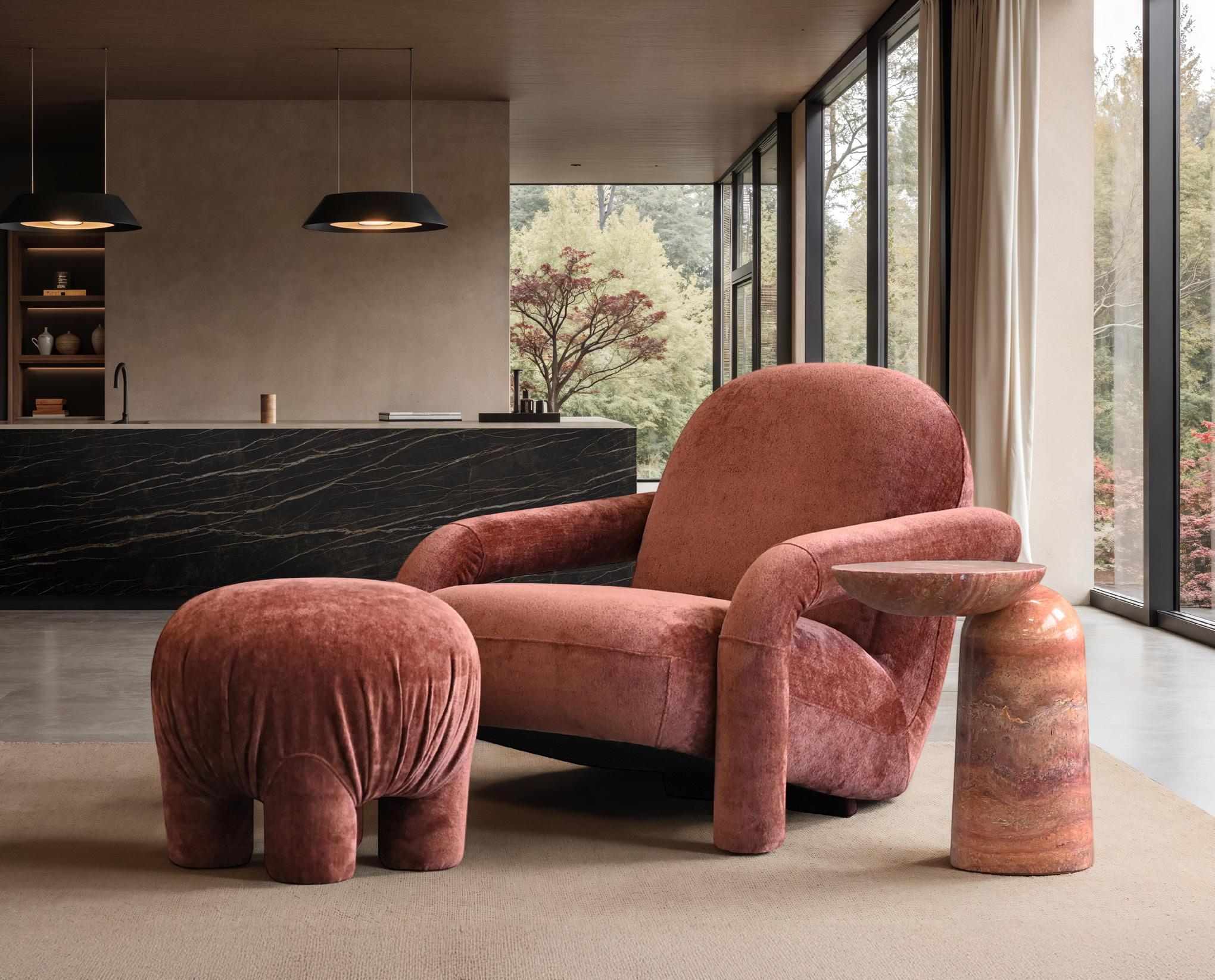 DISCOVER THE PERFECT BLEND OF COMFORT AND ELEGANCE WITH THE BLUME LOUNGE CHAIR, YOUR NEW SANCTUARY OF RELAXATION. WRAPPED IN IRRESISTIBLY SOFT CHENILLE FABRIC IN A DEEP COPPER HUE, IT INVITES YOU TO SINK IN AND UNWIND AFTER A LONG DAY. PAIR IT WITH THE CHARMING BIBI OTTOMAN, A MATCHING COMPANION THAT ELEVATES YOUR LOUNGING EXPERIENCE. WHETHER YOU’RE CURLING UP WITH A BOOK OR ENJOYING QUIET MOMENTS OF REFLECTION, THE BLUME BRING A TOUCH OF LUXURIOUS COZINESS TO ANY SPACE.
