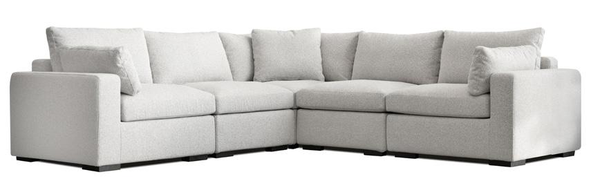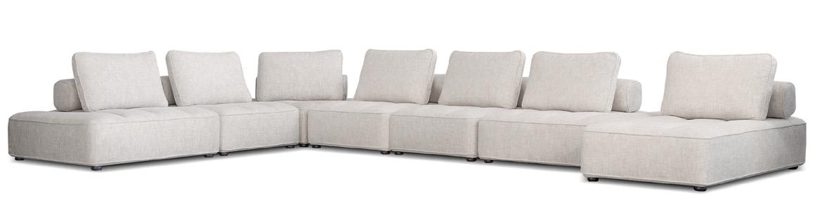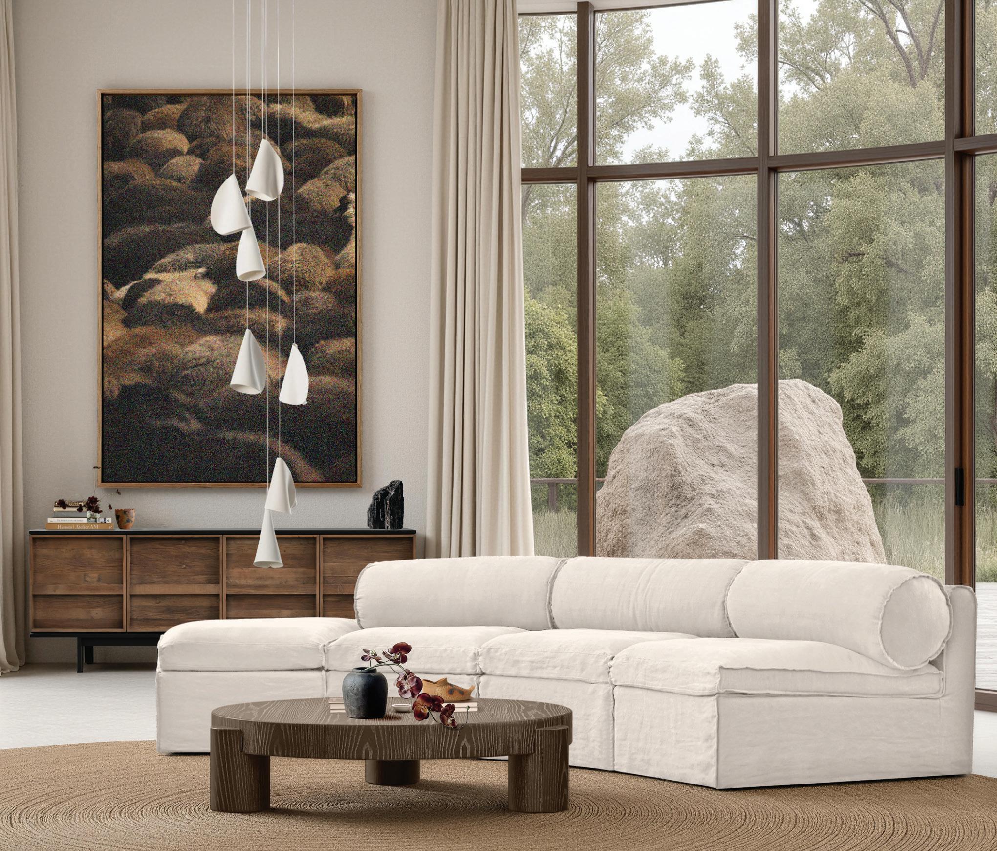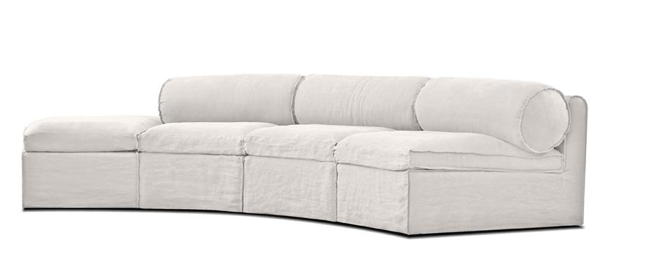 THE FAUNA SECTIONAL IS A VERSATILE CURVED FOUR-PIECE SOFA THAT CAN BE ENHANCED WITH AN ARMLESS ADD-ON OPTION FOR THOSE NEEDING EXTRA SEATING. WRAPPED IN A CHIC CREAMY LINEN-LIKE SLIPCOVER, IT EMBODIES A LAID-BACK CALIFORNIA BEACH VIBE, PERFECT FOR CASUAL YET STYLISH LIVING SPACES. THE BACKRESTS ARE ADORNED WITH EXTRA-LARGE BOLSTER PILLOWS, PROVIDING BOTH COMFORT AND A DISTINCTIVE TOUCH. IDEAL FOR LOUNGING OR ENTERTAINING, THIS SECTIONAL EFFORTLESSLY BLENDS FUNCTIONALITY WITH MODERN AESTHETICS. UPHOLSTERED IN A SOFT AND DURABLE POLY-LINEN PERFORMANCE FABRIC BY CRYPTON. THIS FABRIC FEELS LIKE A CHENILLE WITH A HINT OF LINEN QUALITIES. RESILIENT, EASY TO CLEAN, AND CHIC IDEAL FOR HOMES WITH PETS OR CHILDREN. THIS FABRIC CHOICE IS GREENGUARD GOLD CERTIFIED.
