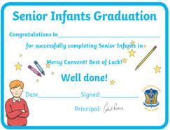 Sadly, each year we have to say goodbye to our 6th class girls and senior infant boys and they will mostcertainly be missed. On behalf of all the staff here I just want to say howproud we are of all our boys and girls as they leave our school. They arecredit to theirfamilies, and we hope they had a worthwhileschoolexperience here with us. We wish them everysuccess and happiness on the next part of their educational journey.