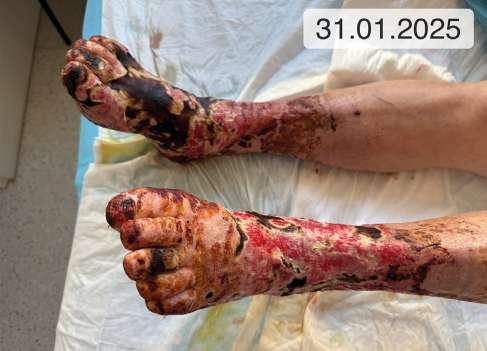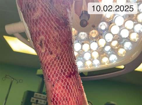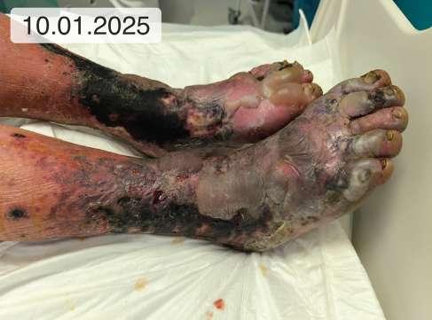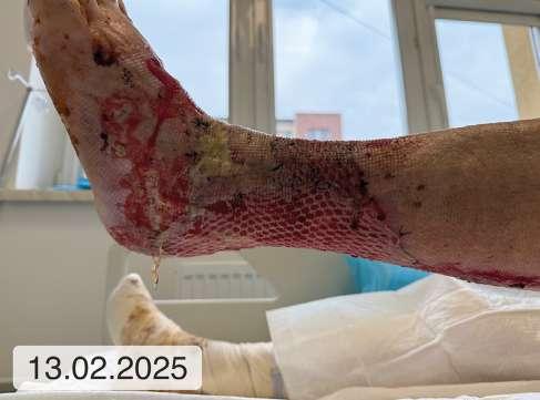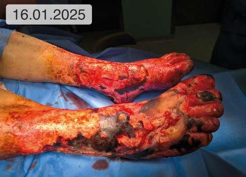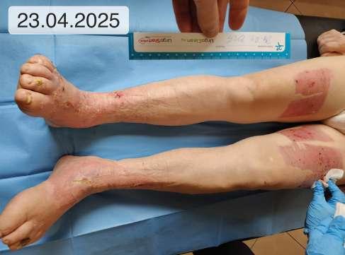 Wound care: The amputation wound was disinfected with a sterile gauze pad soaked in Octenisept disinfectant and left on the wound for 1 minute. The wound was dressed with a 5 × 7 cm non-adhesive Biatain foam dressing and secured with mesh underwear. This dressing was used for the entire patient‘s stay (5 days). Due to the risk of skin trauma, plasters were not used. The dressing was changed daily. The scrotal wound was disinfected with Octenisept and secured with sterile gauze pads. To optimize wound healing, increased caloric, protein, and trace element intake was introduced. After 5 days of stay, the patient was discharged at his request. He received a referral to the wound care outpatient clinic, along with information about his previous wound care