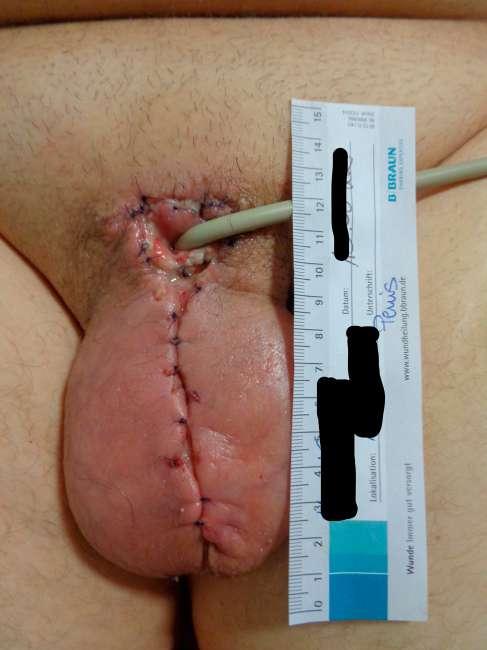 55–85% of people who self-harm attempt suicide [3]. One of problems may be difficulties in caring for wounds after genital amputation. Genital wounds are associated with an increased risk of infection, difficulty maintaining a wound dressing, and pain. Genital wounds heal rapidly, with significant swelling and absent or barely visible scarring, which is related to the anatomical and physiological differences in this region (lack of subcutaneous fat, high mobility of the skin relative to underlying tissues, abundant elastic fibers, persistent bacterial colonization, and rapid resolution of inflammation) [4]. Genital skin defects can be managed using a variety of techniques, including primary closure, local flaps, full-thickness skin grafts, and split-thickness skin grafts [5]. Perineal skin grafting carries the risk of graft rejection due to infection, difficulty in stabilizing the graft due to genital mobility, and fluid accumulation in the form of blood, serous, and purulent exudate. For penile reconstruction (if the amputated portion is inaccessible or not suitable for reimplantation), myoplasty (possible sexual satisfaction) or myocutaneous flap grafting with prosthesis implantation are used [5]. Donor penile transplantation with immunosuppressive therapy
