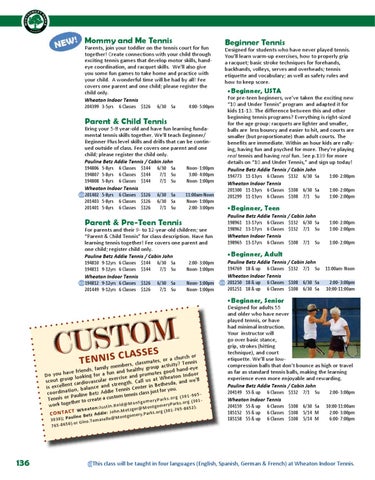 For parents and their 9- to 12-year-old children; see “Parent & Child Tennis” for class description. Have fun learning tennis together! Fee covers one parent and one child; register child only. Pauline Betz Addie Tennis / Cabin John 194810 9-12yrs 6 Classes $144 6/30 Sa 194811 9-12yrs 6 Classes $144 7/1 Su Wheaton Indoor Tennis 194812 9-12yrs 6 Classes $126 6/30 Sa 201449 9-12yrs 6 Classes $126 7/1 Su