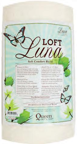 Luna Loft Cotton Blend BOLT 96" x 10yd •LB 2196• Pack 10yds Retail $10.99yd (FCBAG|41532U Luna Loft Cotton Blend 96" x 10yd BLACK •LB 2196B• Pack 10yds Retail $10.99yd (FCBAG|41533R Made with long staple cotton and the softest polyester to create a soft comfort blend. Will not shift or shed. Stitch up to 10" apart! Ideal for machine quilting.