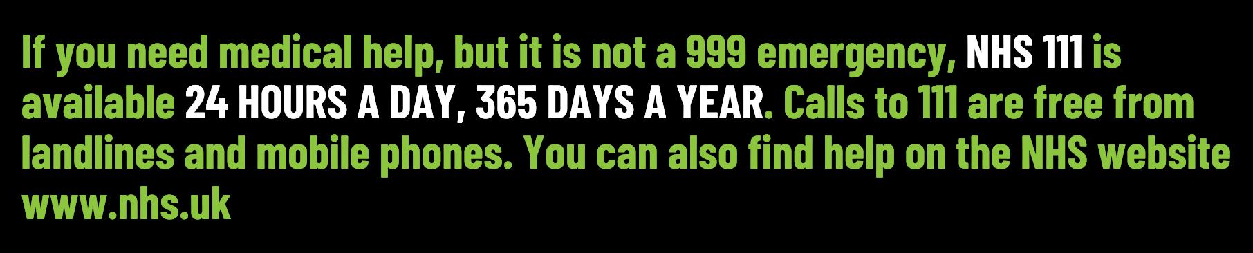 Call 111 if you need medical help fast, but it’s not life-threatening – for example, if you: