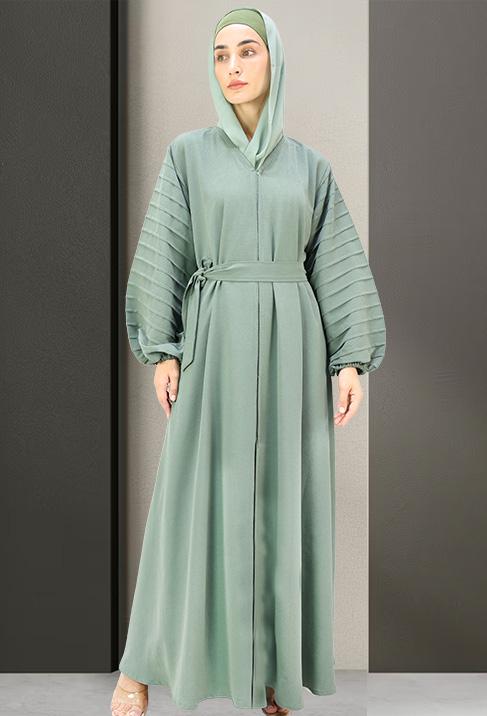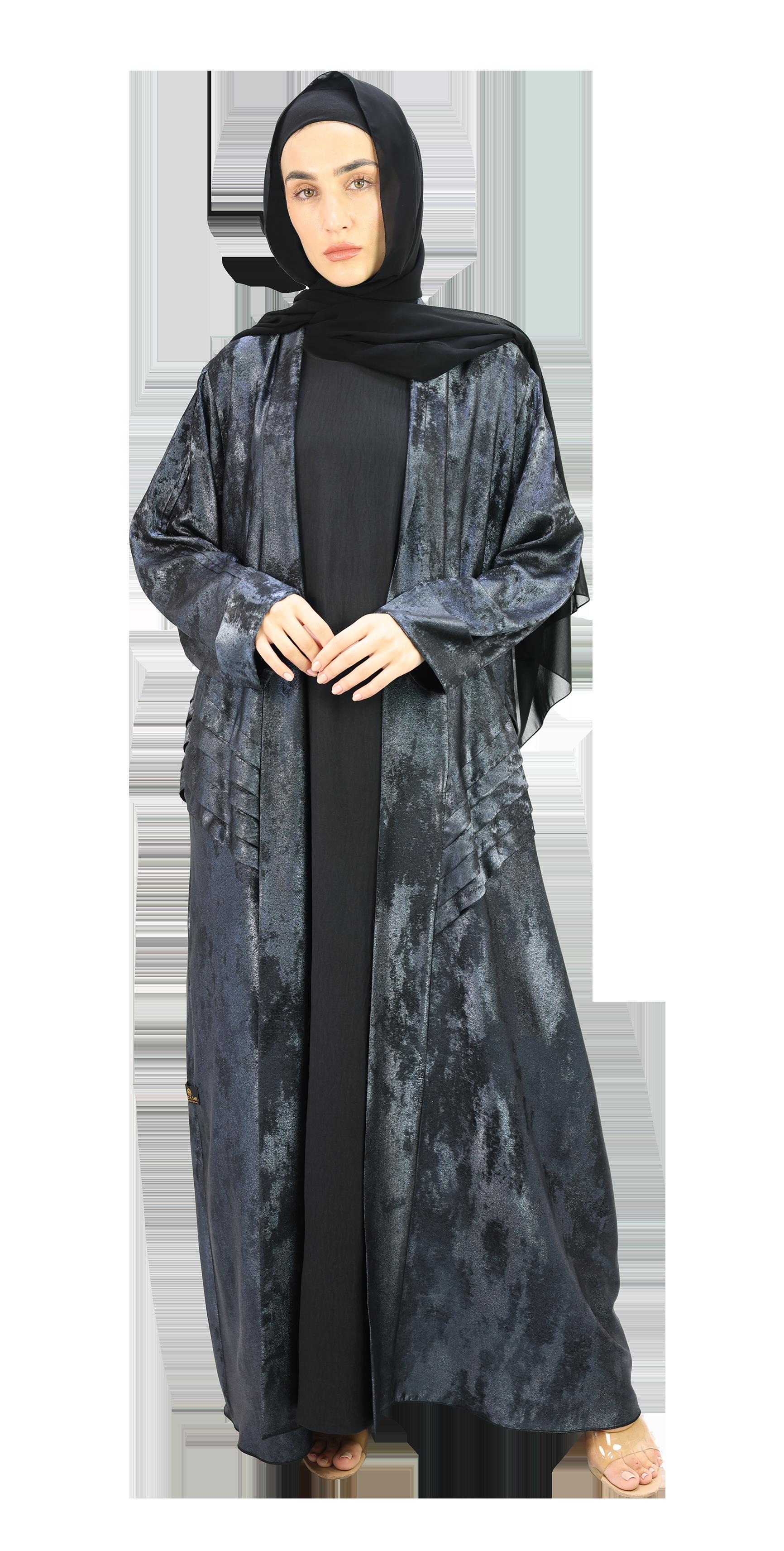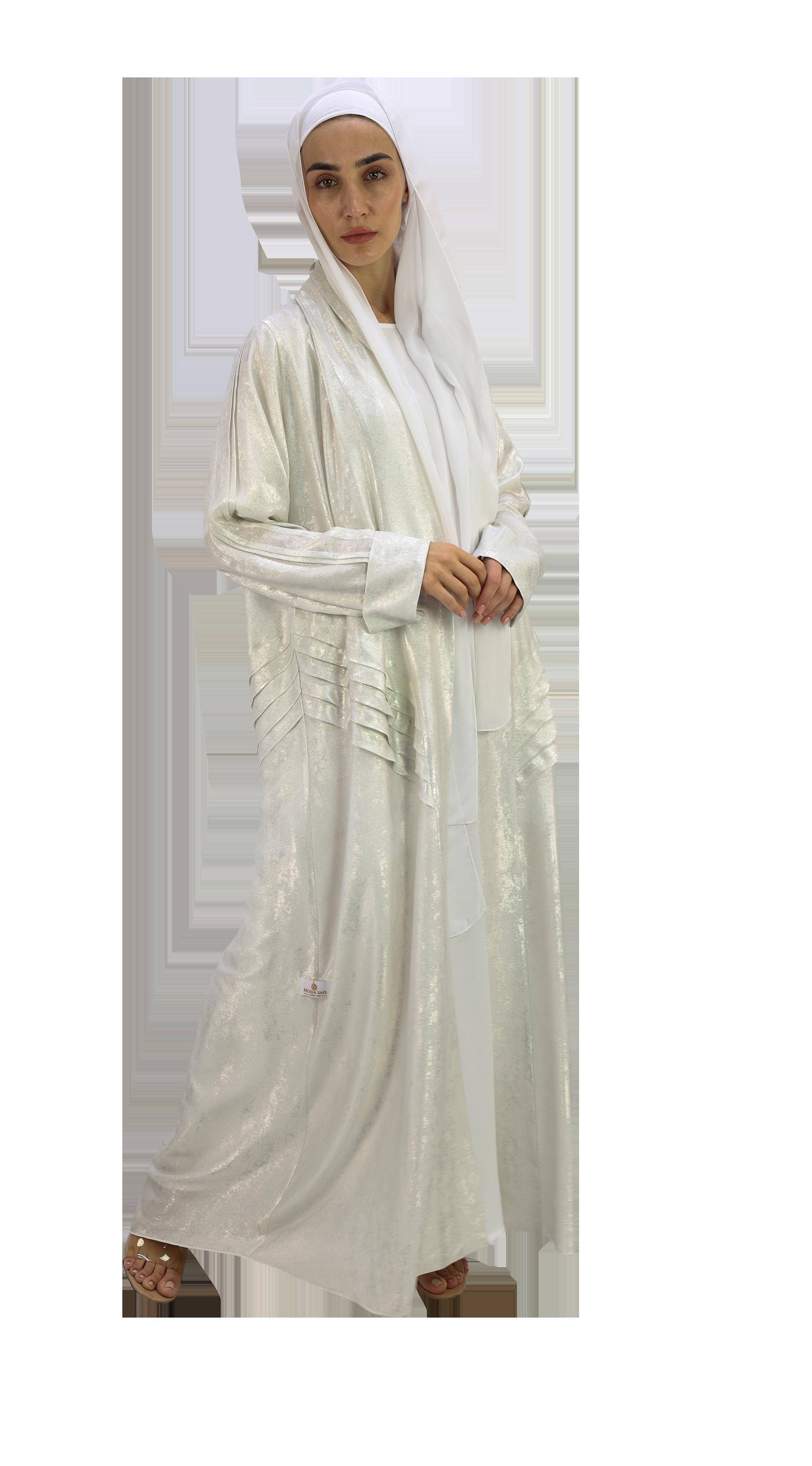Elevate your style with our crushed fabric abaya, featuring pleated sleeves adorned with shimmering silver thread detailing and a chic belt. This exquisite design marries texture and shine, creating a captivating and fashionable ensemble.
