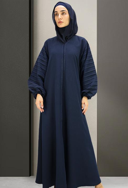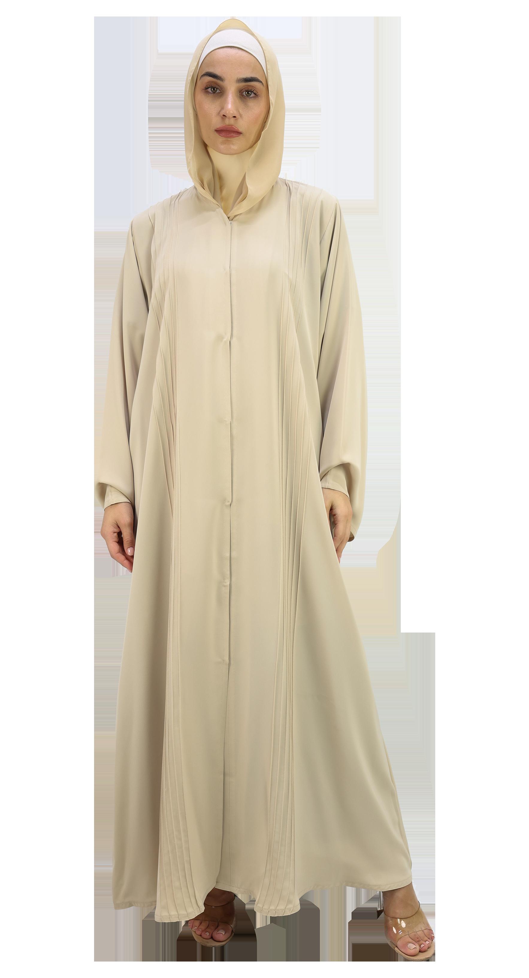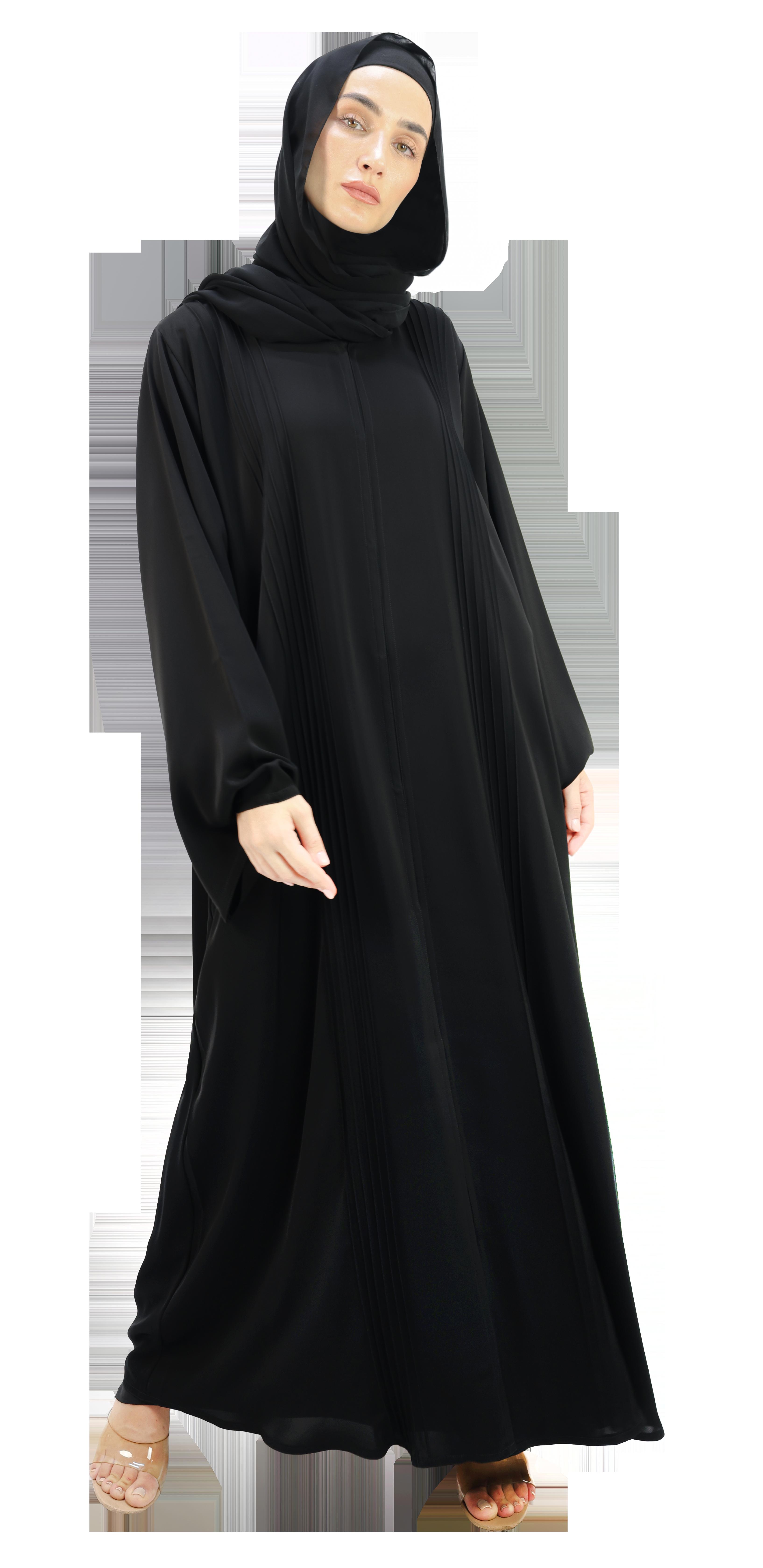 Elevate your style with our A-line abaya adorned with pleated fancy fabric detailing. This exquisite design combines the classic A-line silhouette with the modern charm of pleated embellishments, creating a look that's both timeless and fashion-forward.