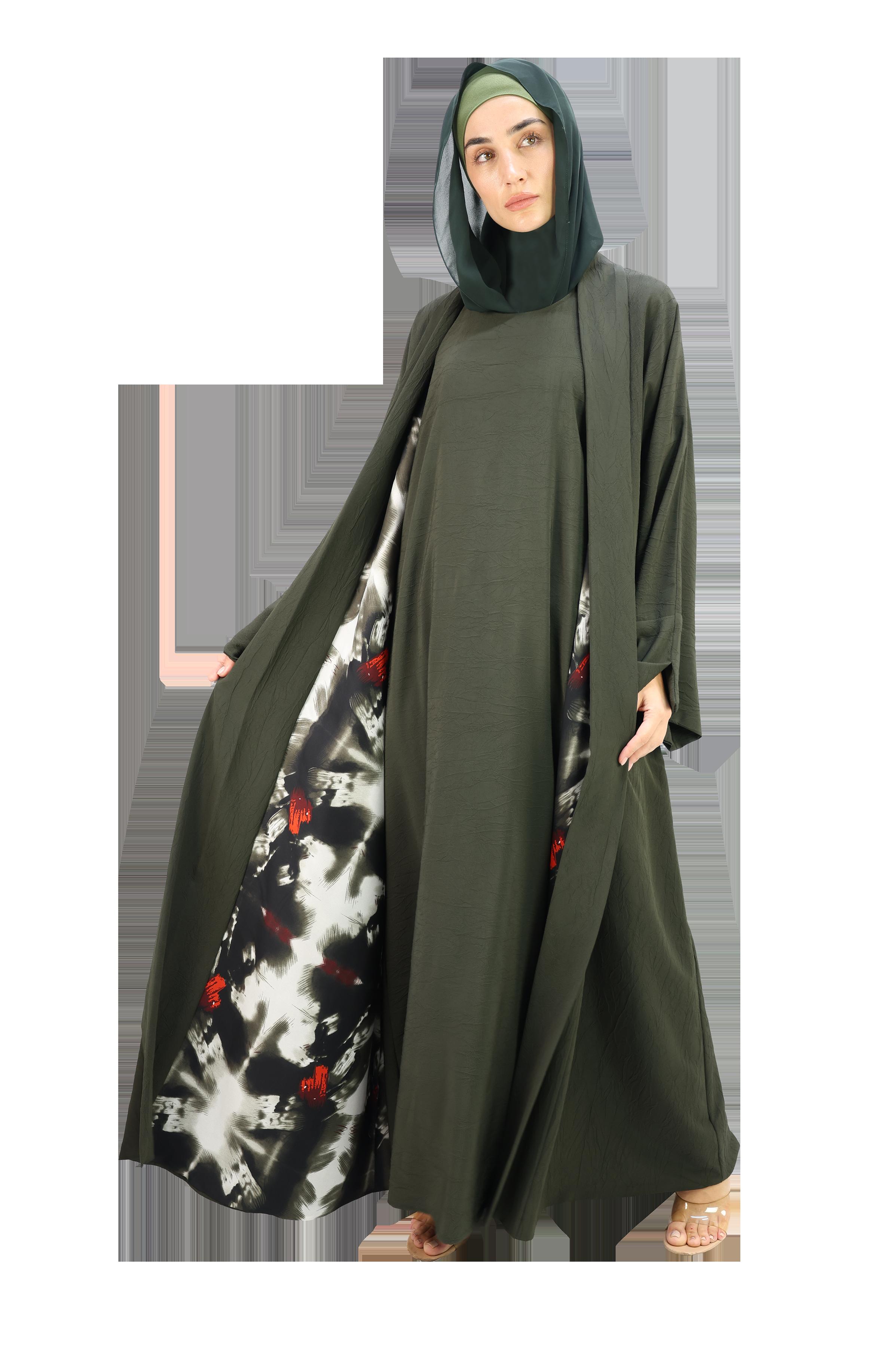 Dive into the world of versatile elegance with our crushed fabric reversible abaya, o ering two captivating looks in one. The reversible design allows you to e ortlessly switch between a serene green and a stylish printed chi on, providing endless fashion possibilities. The crushed fabric adds a rich texture and depth to the abaya, while the printed chi on adds a touch of artistry and charm.