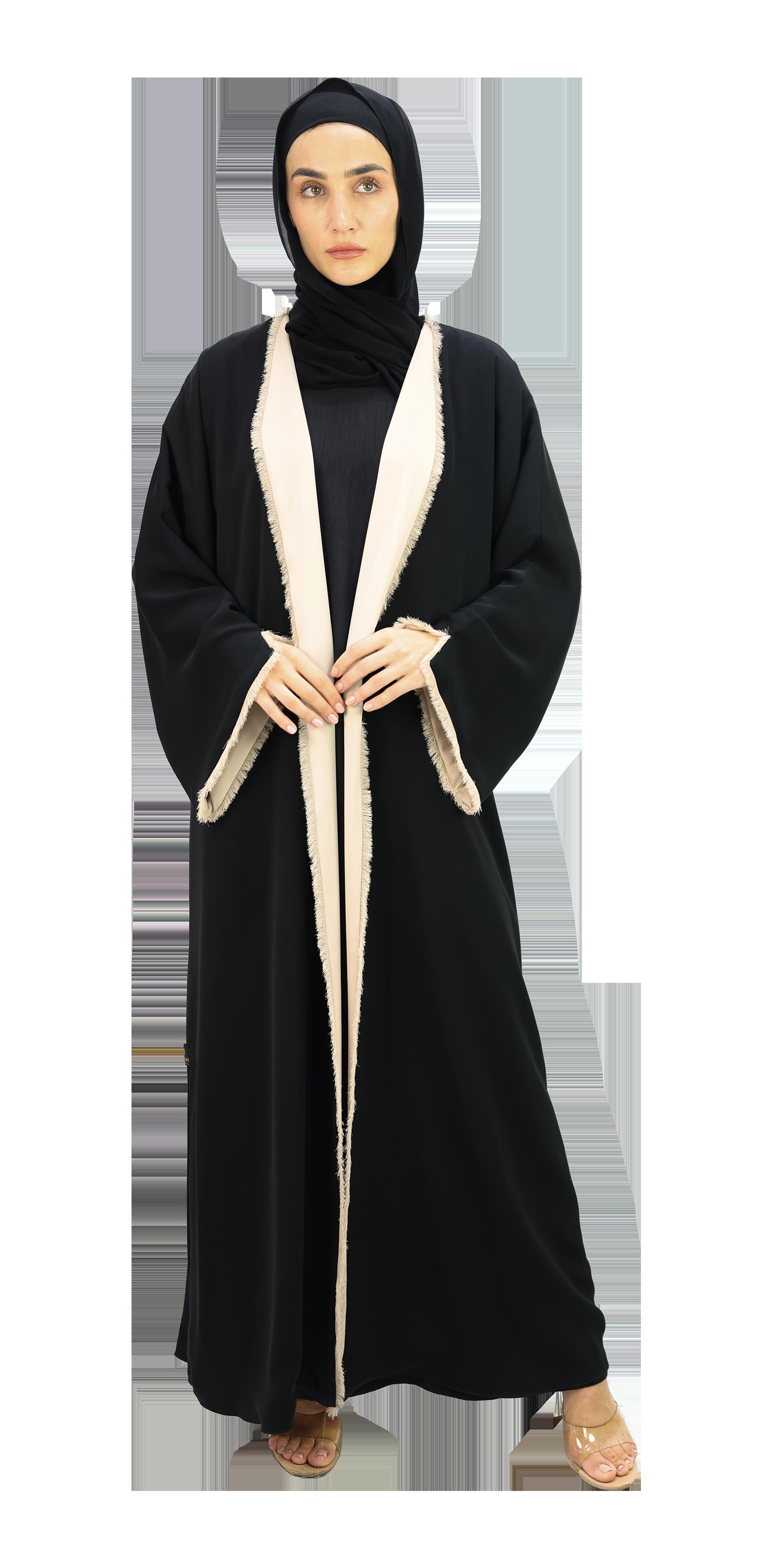 Indulge in the allure of our double-face abaya, featuring a striking thread fall edge. This elegant design boasts two contrasting faces, o ering versatility and style in one exquisite piece. The thread fall edge adds a touch of grace and charm to the abaya, creating a dynamic and captivating look.