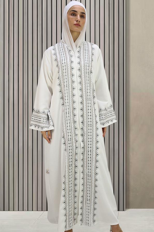 The Arri abaya with pockets and exquisite white pearl hand embroidery work is the epitome of practical luxury. This elegant garment combines the timeless modesty of an abaya with modern functionality, featuring convenient pockets for added utility. The meticulous hand embroidery work with lustrous white pearls elevates its charm and sophistication, making it a standout piece for special occasions or daily wear.